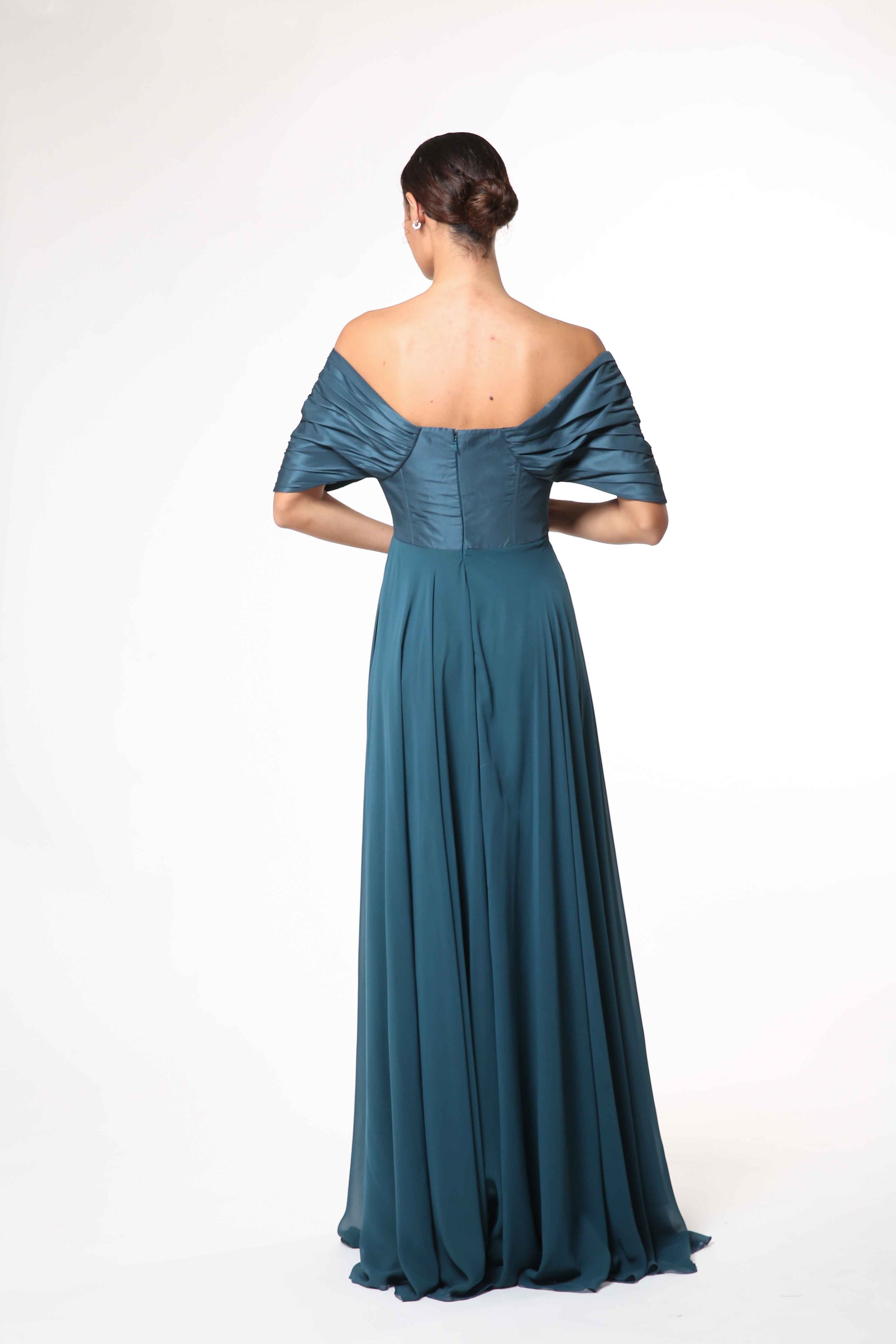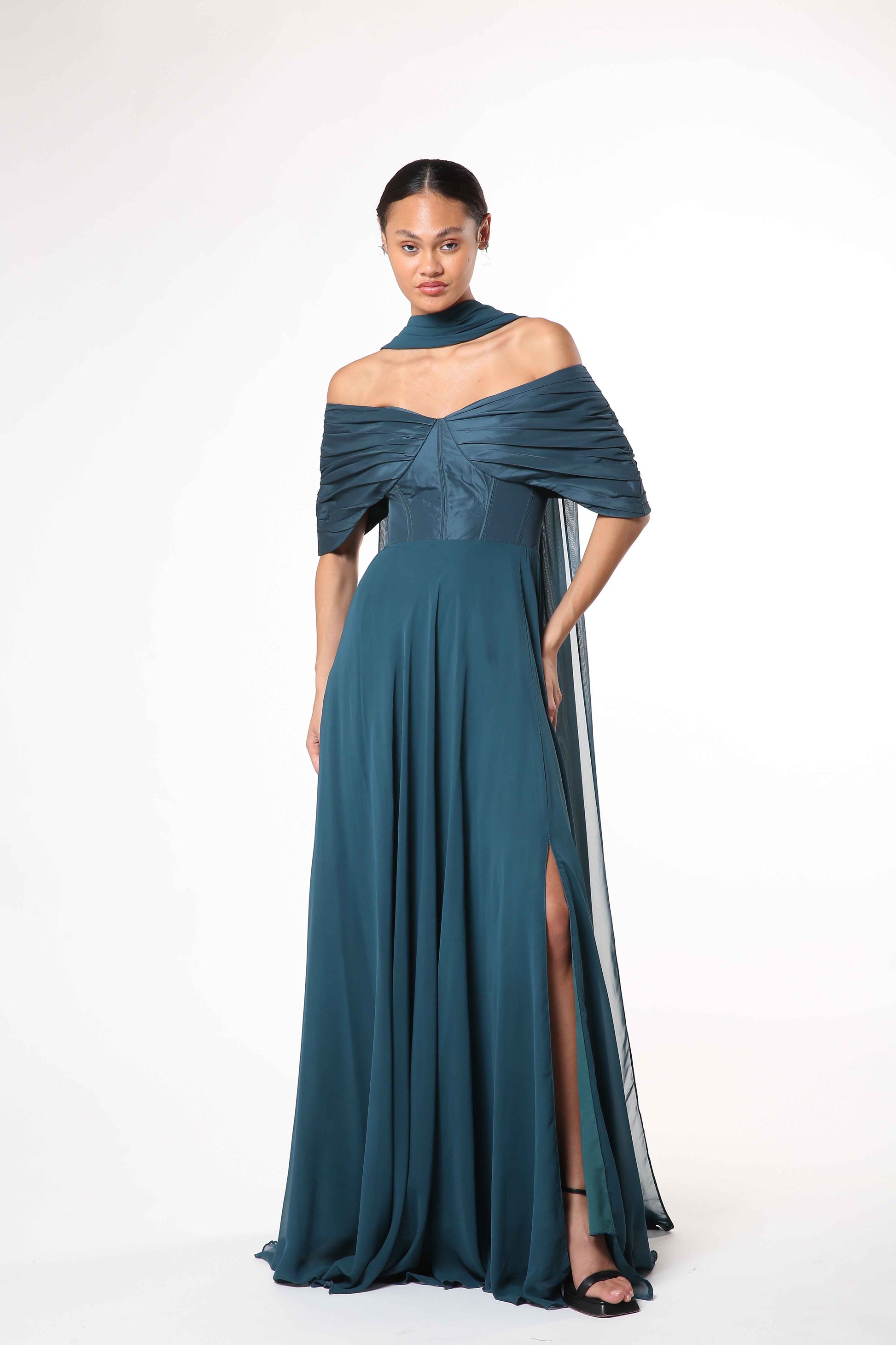 Romantic and regal, this off-shoulder chiffon gown features a sculpted corset bodice and fluid drape.