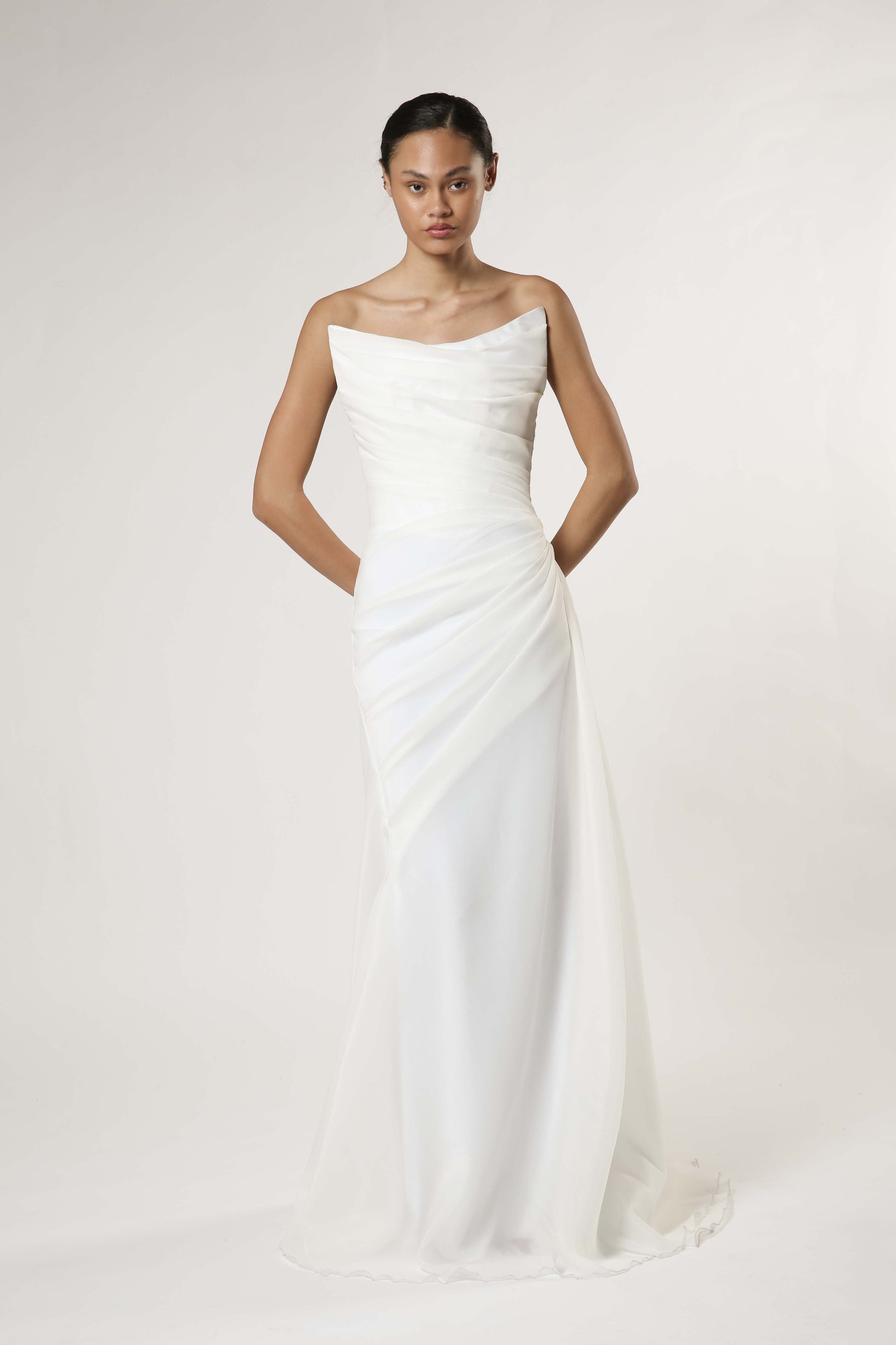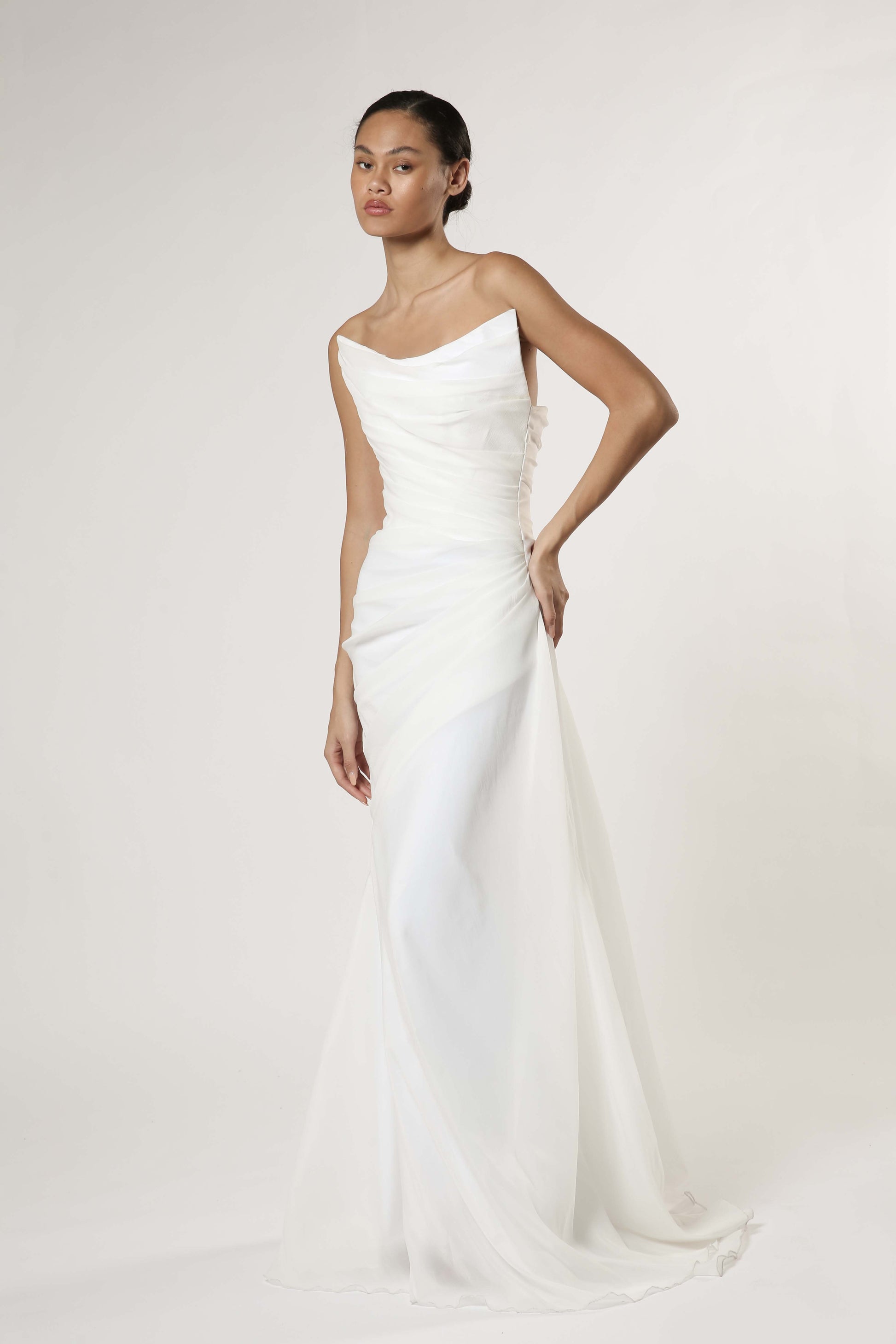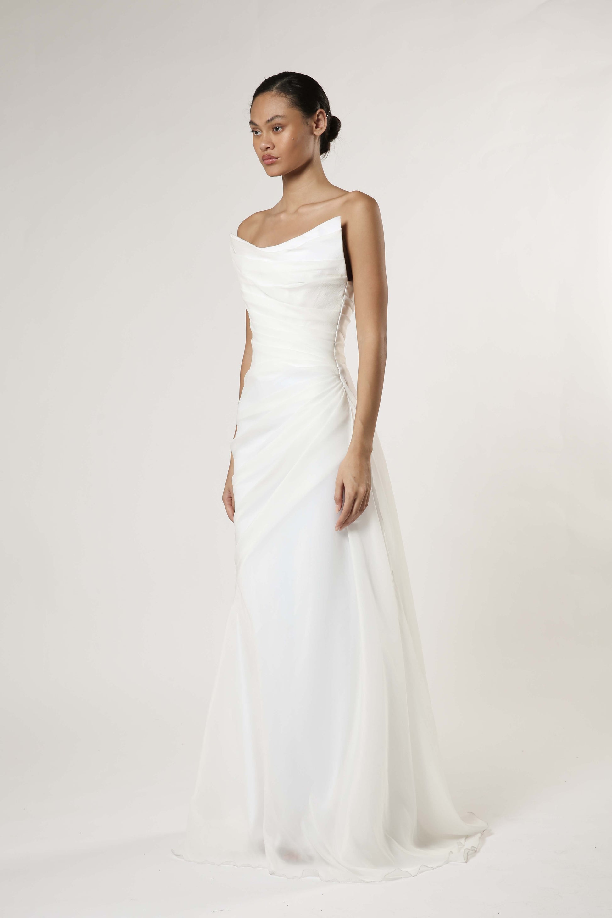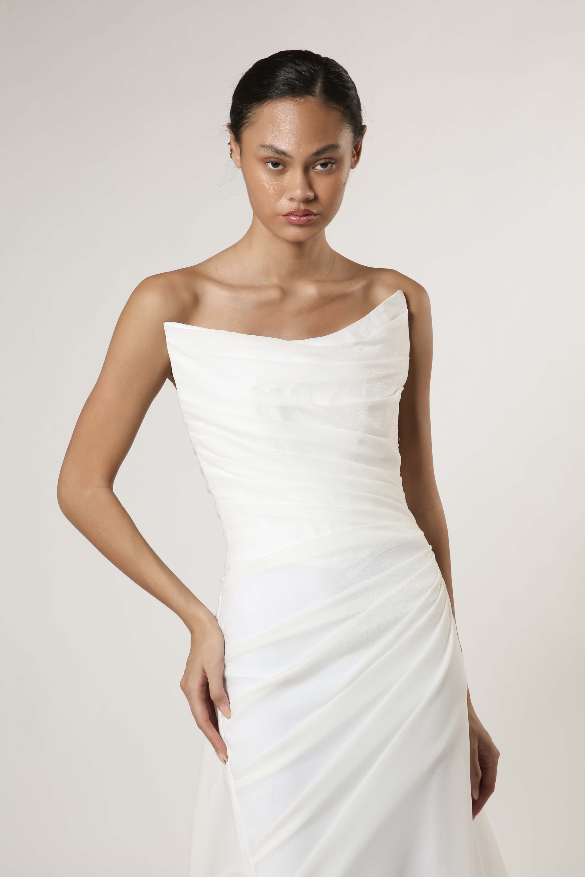 Crafted from lightweight organza, this maxi dress features a sophisticated off-shoulder neckline that enhances your silhouette with elegance. Its fluid drape and luxurious fabric choice provide a refined aesthetic suitable for formal events or evening wear.