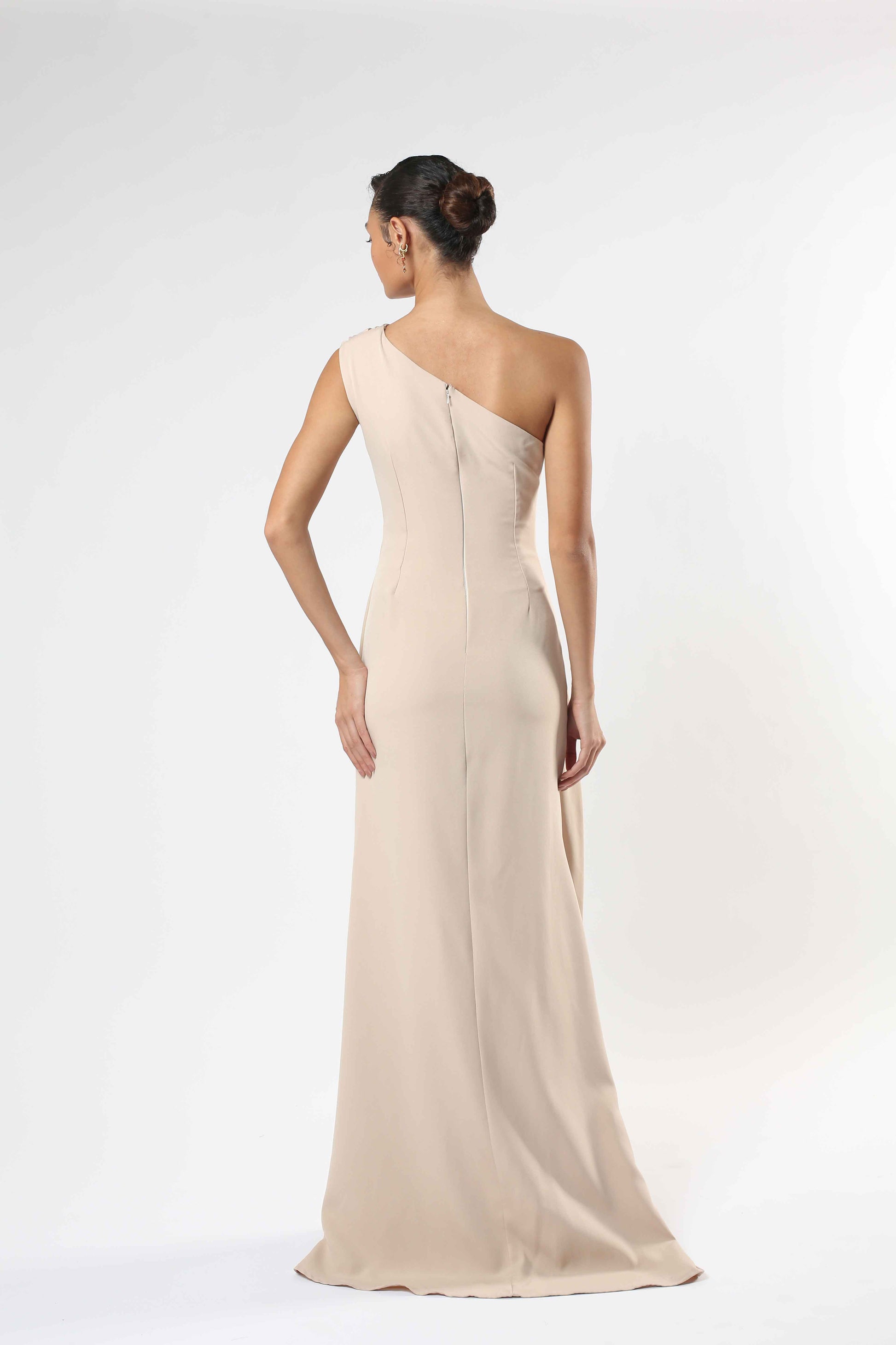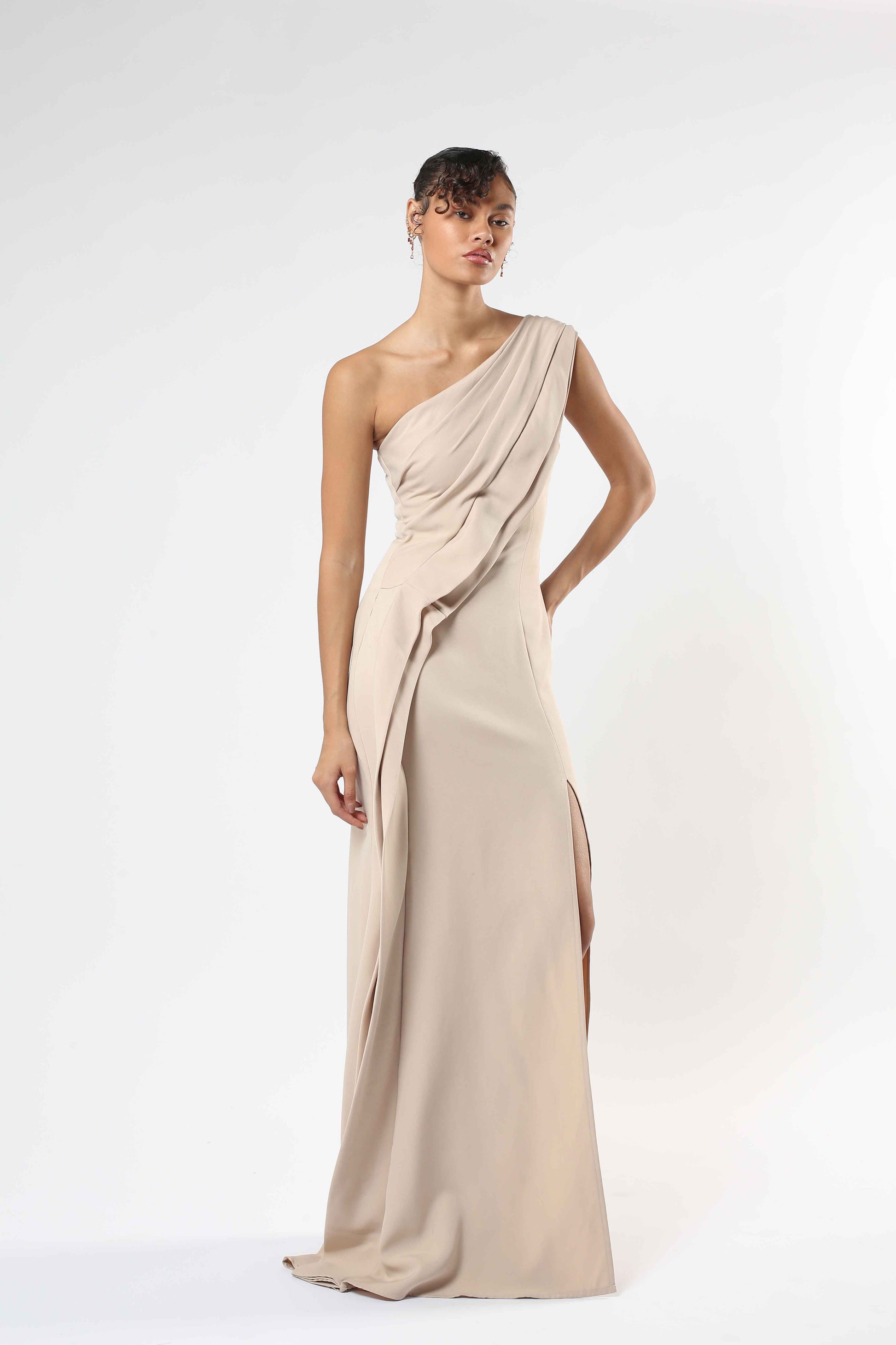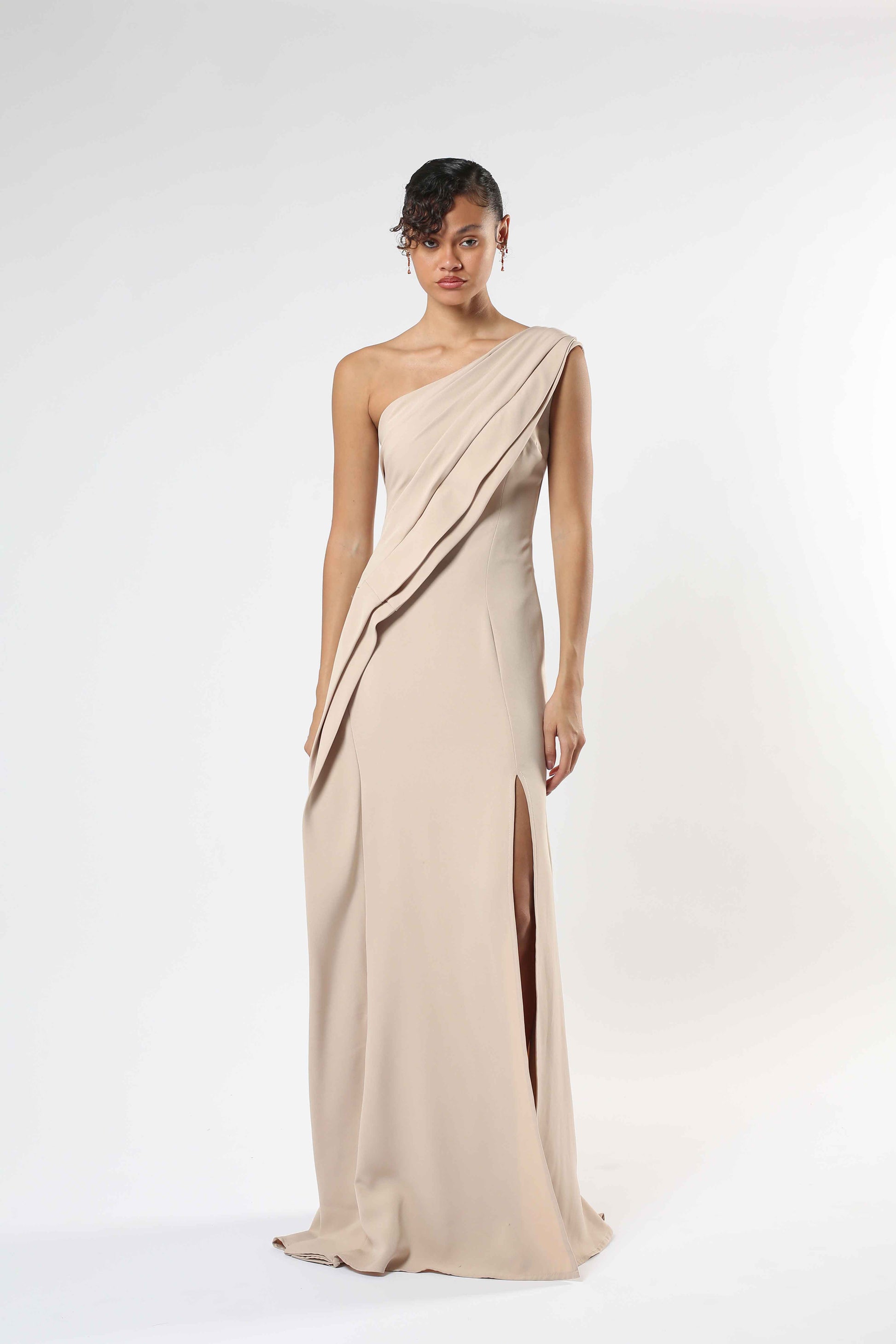 Nude Barbie crepe with sculpted drape detail and a front slit. Minimal yet refined.