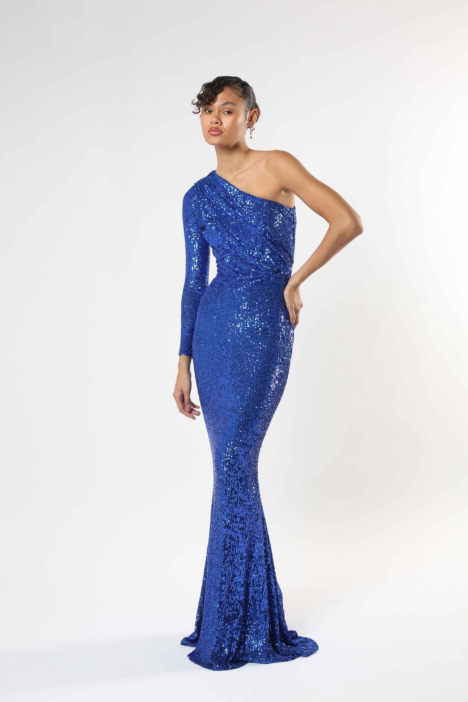 One-shoulder blue sequin gown with long sleeve and a sleek, body-hugging silhouette. Glamorous and radiant.