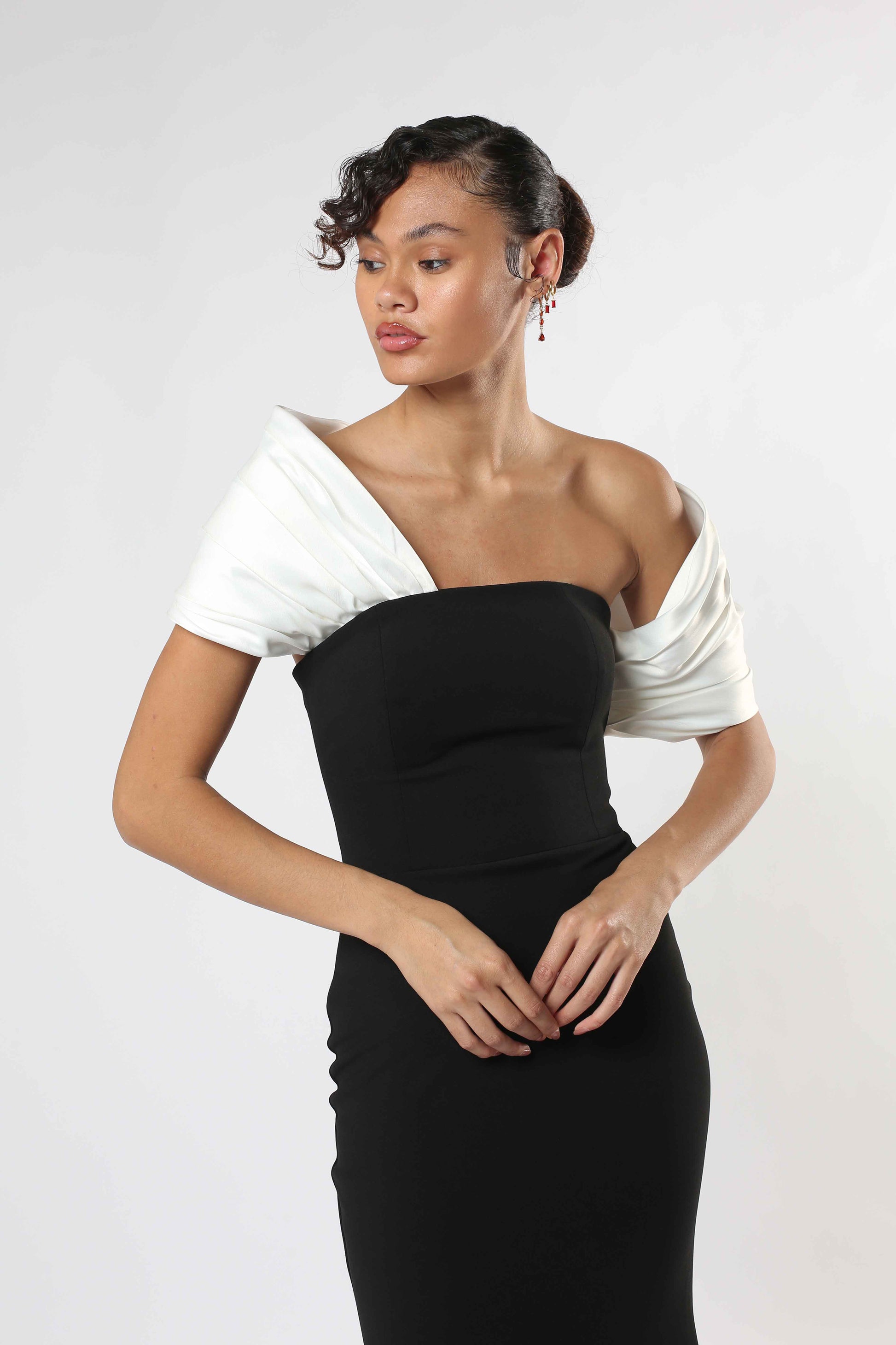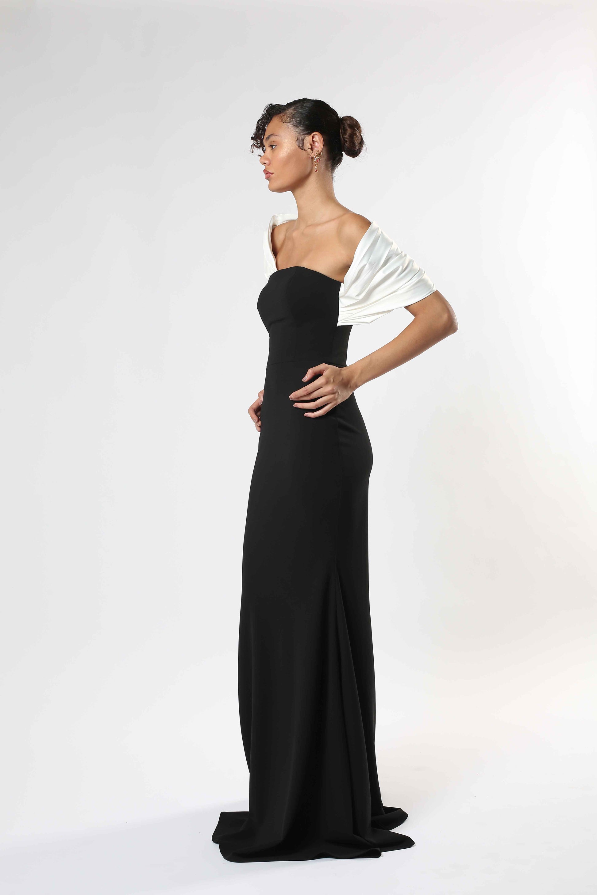 Strapless Scuba-Satin black gown with a sculpted white off-shoulder wrap detail. Chic and timeless.